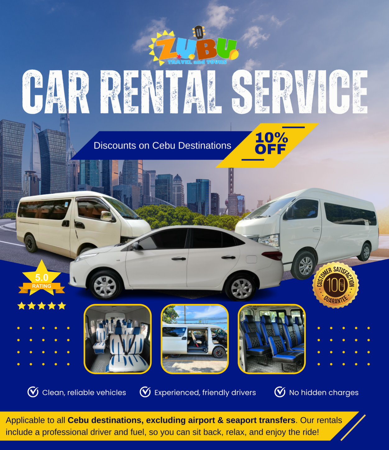 We offer an exclusive 10% off on all car rental services for Cebu destinations, excluding airport and seaport transfers. Whether for a city tour, business trip, or out-of-town getaway, we’ve got the perfect ride for your guests.