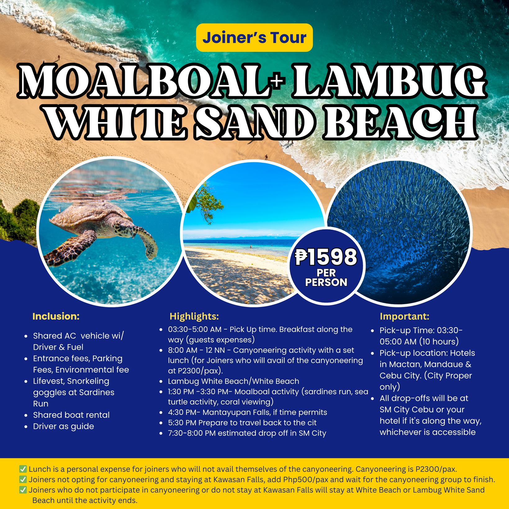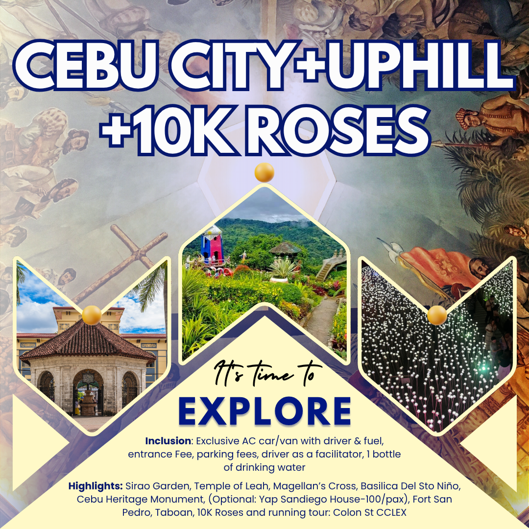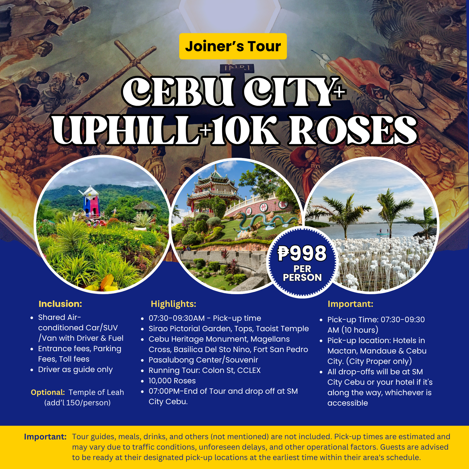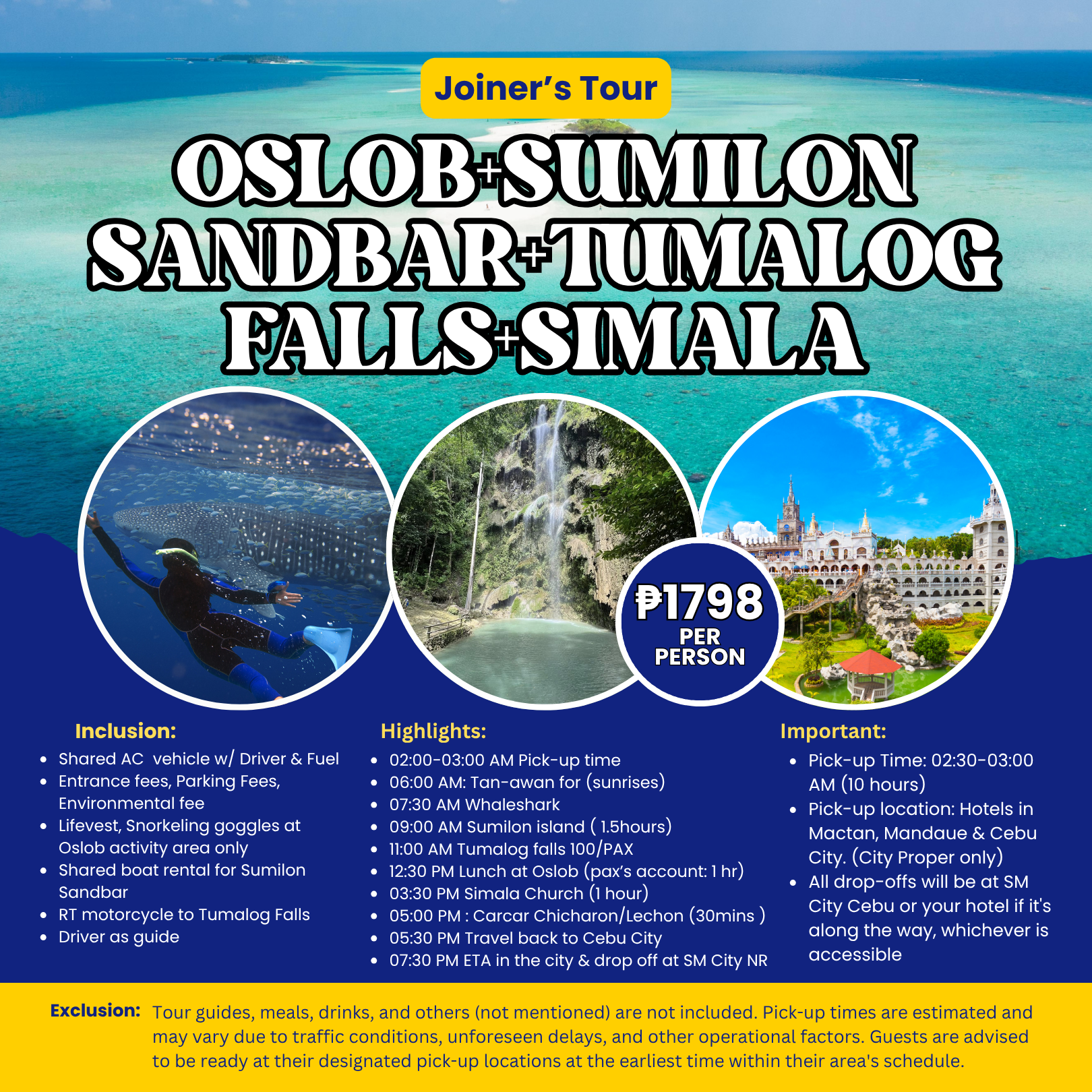 Experience the best of Cebu with our budget-friendly joiner tours! Explore the city’s top attractions including the scenic Uphill spots and the famous 10K Roses, enjoy the underwater wonders of Moalboal with sardine run and turtle spotting plus chill time at Lambug Beach, and encounter whale sharks in Oslob, relax at Sumilon Sandbar and Tumalog Falls, and visit the sacred Simala Shrine—all in shared tours designed for adventure and savings.